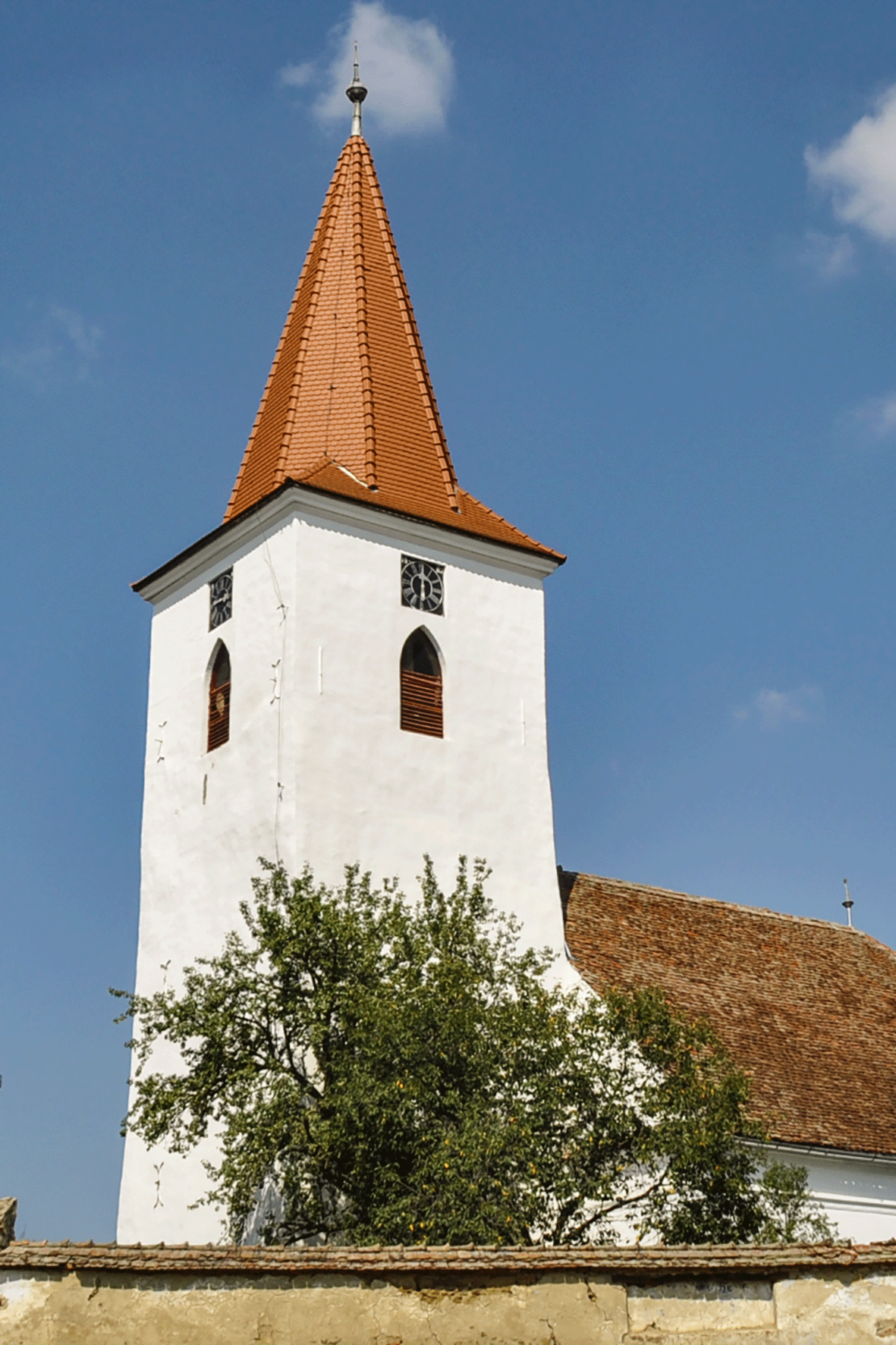 Der Kirchturm hat an allen vier Seiten ein Ziffernblatt mit einem Stundenzeiger.