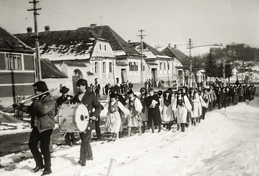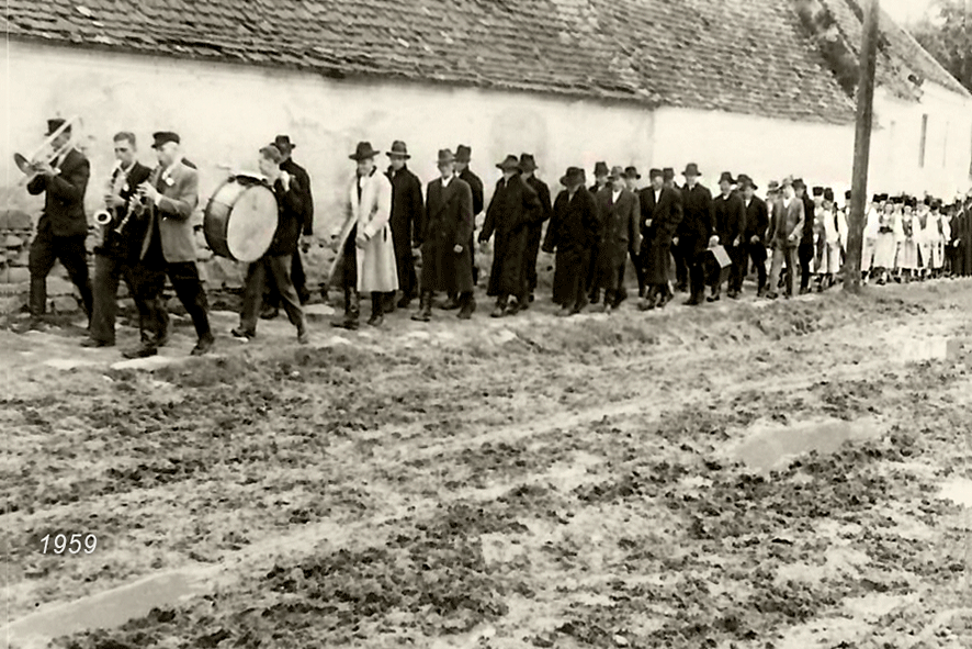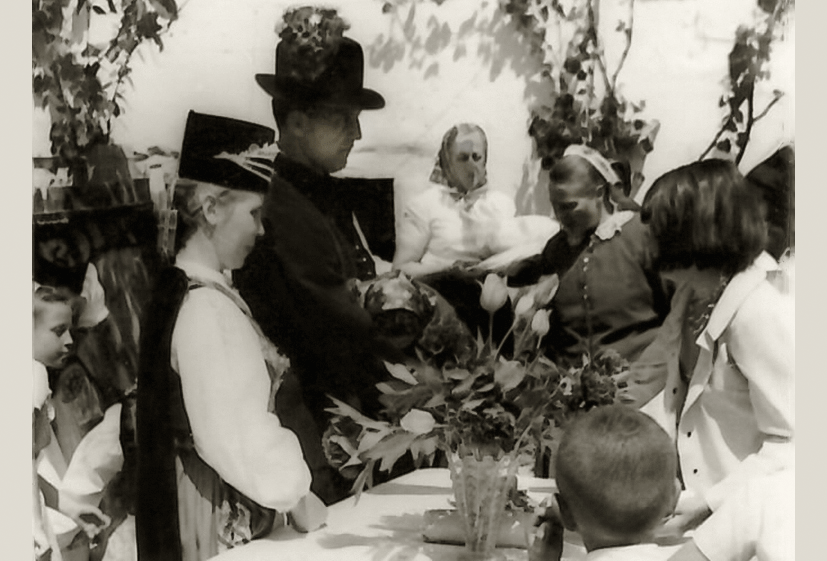 Am Hochzeitstag, einem Sonntag, trafen sich die Gäste im Hochzeitshaus, wo sich der Hochzeitszug formierte. Unter Glockengeläut, zum Takt eines Marsches, gespielt von der Blasmusik, ging es zur Kirche, wo die Trauung während des Gottesdienstes stattfand.