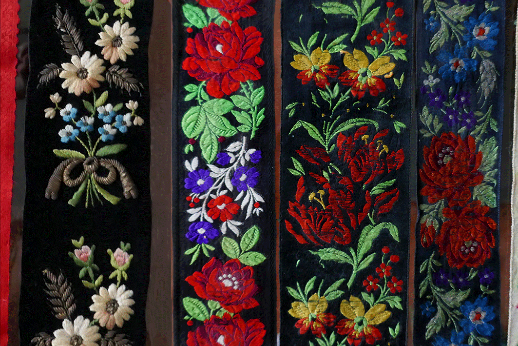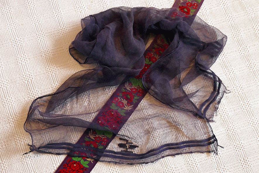 - Langes schwarzsamtenes seidenbunt besticktes Kopfband, das im Nacken gekreuzt und dessen Enden zu beiden Seiten über die Brust bis zur Taille fallen.