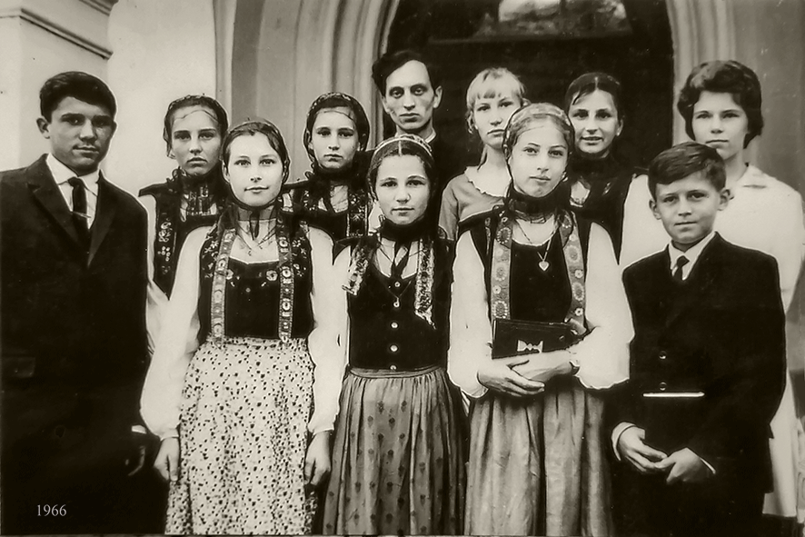 - Schwarze oder blaue Kirchenkleider bestehend aus waden- bis knöchellangem glattem Rock „Pändel“ ohne Aufputz, dem Mieder „Leibel“ einfach oder bunt bestickt und einer taillenkurzen im Schnitt sehr einfache Jacke „Giup“, kragenlos oder mit einem schmalen Stehkragen und Druckknöpfen.